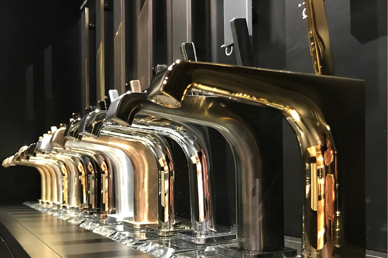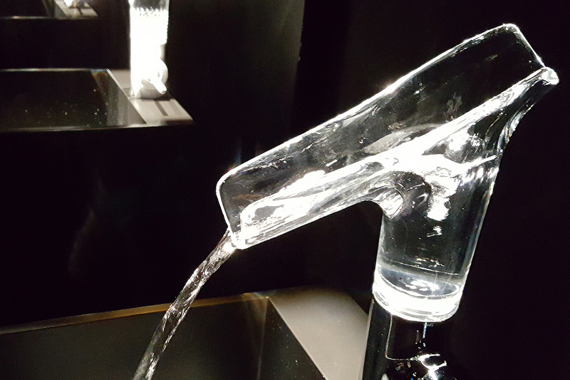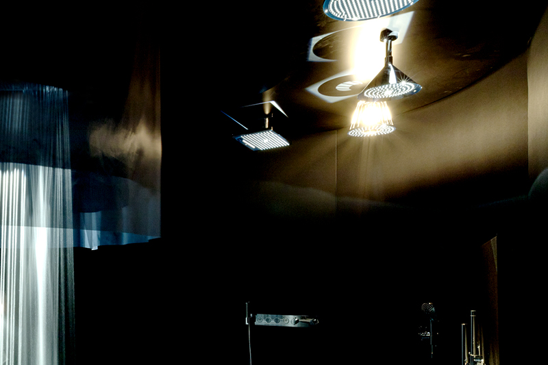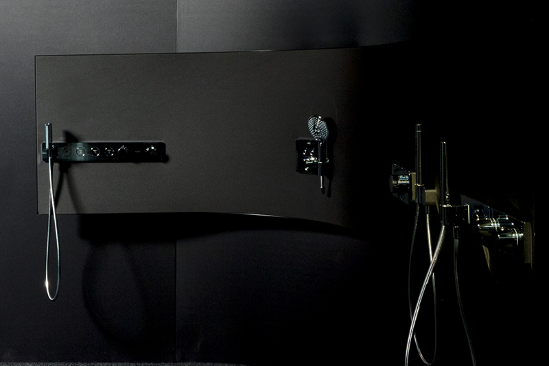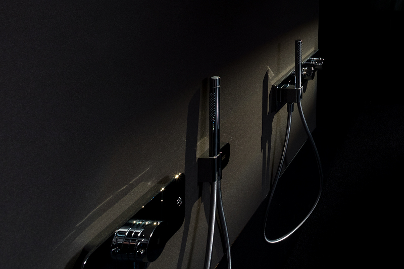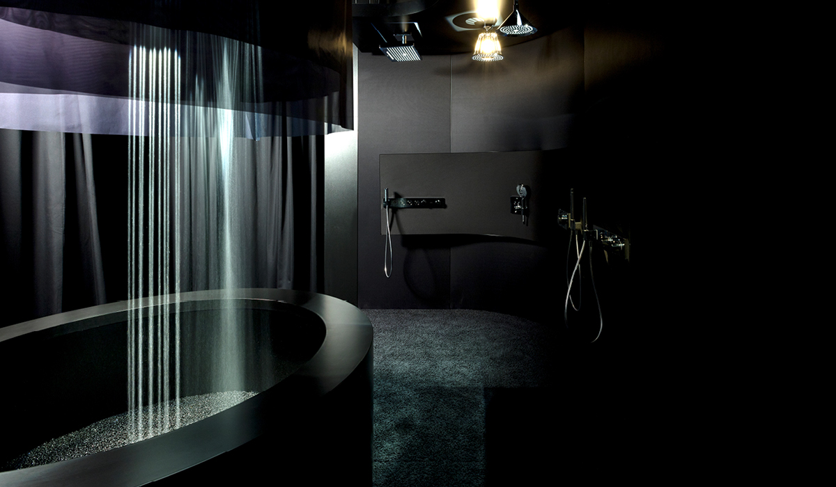 Der Raum bleibt insgesamt dunkel und zurückgenommen. Eine gezielte Lichtführung lenkt den Blick dahin, wo er hingehört: auf Wasser und Produkt. Spielerisch lässt sich das Licht je nach Situation führen – mal auf den Wasserstrahl, mal auf die einzelnen Produkte.