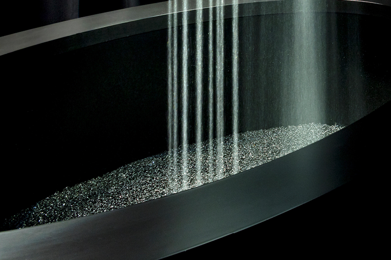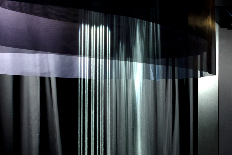 Unten sorgt ein schwarz lackierter Brunnentrog für Klarheit und Fokus. Darüber bringen transparente Maschenstoffe Leichtigkeit ins Bild und übersetzen die Feinheit des Strahls. Ein speziell entwickeltes Lichtsystem setzt einzelne Produkte per Spot gezielt in Szene. Je nachdem, was gerade gezeigt werden soll.