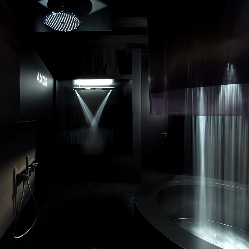Schwarz bleibt die Bühne, Wasser der Hauptdarsteller. Beim Eintreten sieht der Besucher im Wesentlichen zwei Dinge: das weiß hinterleuchtete AXOR Logo und den inszenierten Strahl. Mehr braucht es nicht, wenn Präzision spürbar werden soll.
