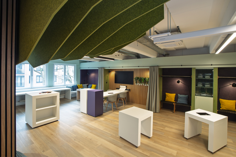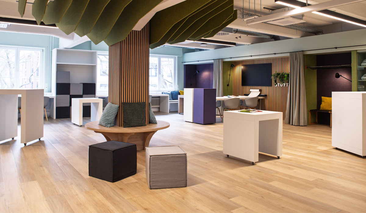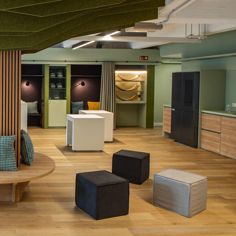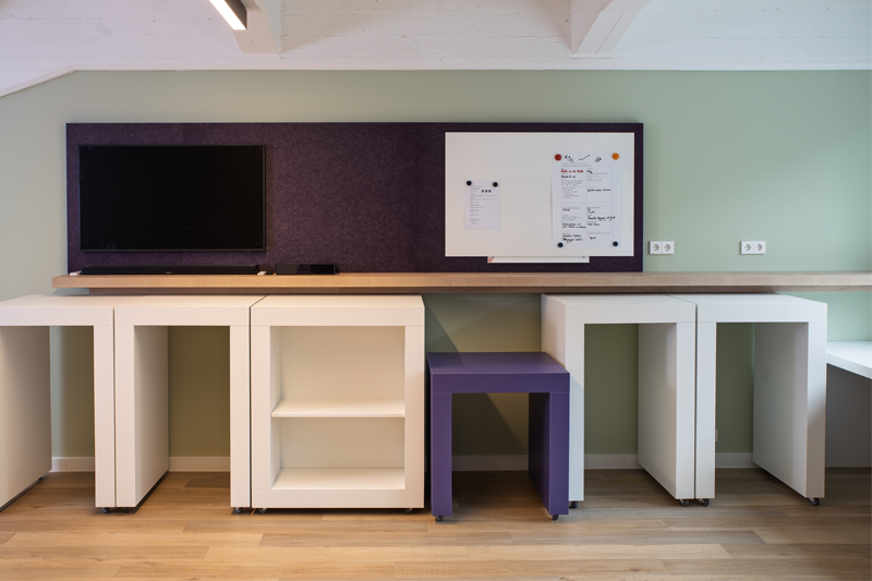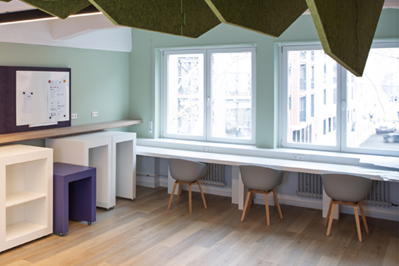 Ein Schritt zur Seite, ein anderer Blickwinkel, ein neues Gespräch. Die Kooperationsinsel lädt dazu ein, die Positionen zu wechseln. Die Tische lassen sich flexibel kombinieren, die bunten Sitzwürfel individuell zusammenstellen, die Flächen unterschiedlich nutzen.