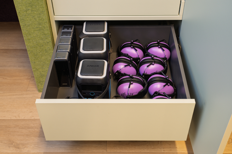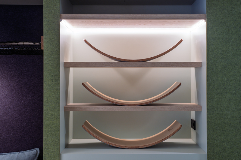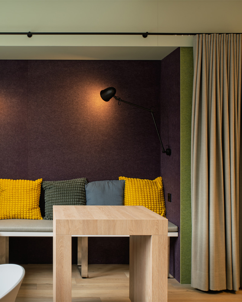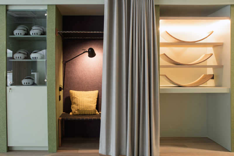 Inspiriert hat unsere Innenarchitektin eine Kindheitserinnerung an Fahrten im Schlafwagen: Gepäcknetze am „Wagenhimmel“, Stauraum für Schuhe und Rucksack unter der Liege, der Akustikvorhang geschlossen und der Raum öffnet sich für Ruhe, Konzentration und kreatives Denken. Dies ist besonders für neurodiverse Personen wertvoll, die bewusste Pausen benötigen.
