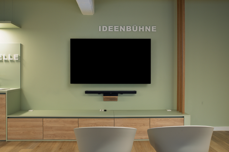 Lernen gelingt am besten, wenn Ideen geteilt und weitergedacht werden. Die Ideenbühne bietet Raum für Präsentationen in vielen Formen – von kurzen Updates bis zu ausführlichen Ergebnissen. Ein Bildschirm unterstützt bei Bedarf dabei, aber auch magnetische Whiteboards oder physische Modelle finden ihren Platz auf der Ideenbühne.