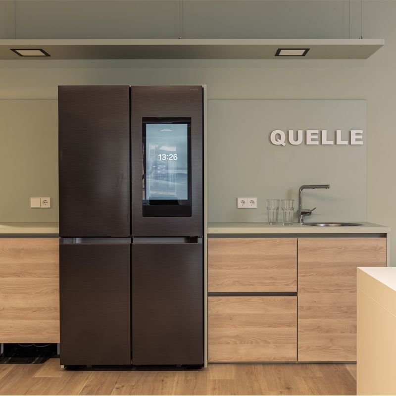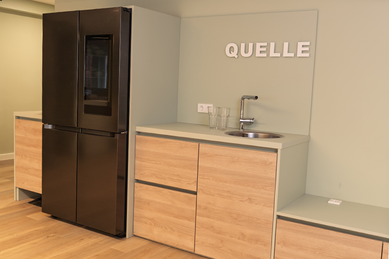 Auch hier steckt Bedeutung im Detail. Direkt über dem Wasserhahn steht das Wort „Quelle“. Eine leise Erinnerung daran, dass und die Welt um uns herum ständig in Bewegung ist.