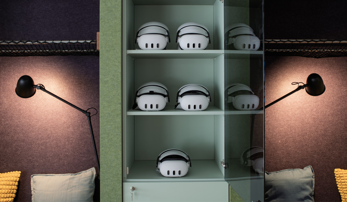 Technik wie mobile Endgeräte, Bildschirme und VR-Brillen sollen präsent sein, ohne den Raum zu überladen oder dominant zu wirken. Deshalb sind alle technischen Elemente harmonisch in den Innenausbau integriert – über farblich abgestimmte Anstriche, klare Ordnung und bewusst zurückgenommene, teils versteckte Installationen.