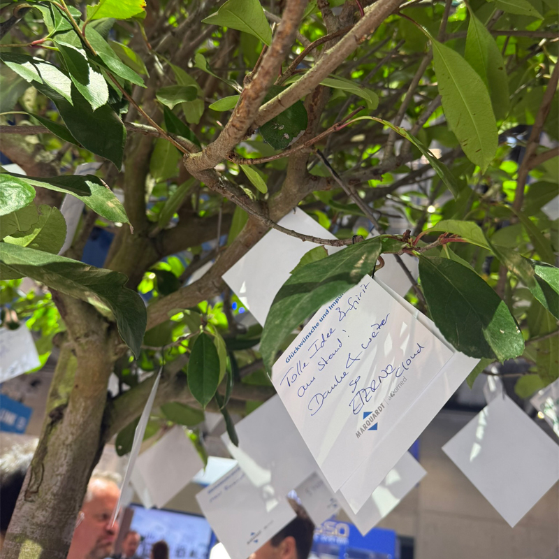 Bereits aus der Ferne zieht das zentrale Keyvisual die Blicke auf sich: ein 130 Kilogramm schwerer Baum, der den Stand prägt und als Dreh- und Angelpunkt unserer Ideenwerkstatt dient. Besucher können ihre Wünsche, Ideen und Glückwünsche zum 20-jährigen Firmenjubiläum an den Baum hängen. Gespräche und Diskussionen entstehen hier bewusst jenseits von Vertrieb und Verkauf.