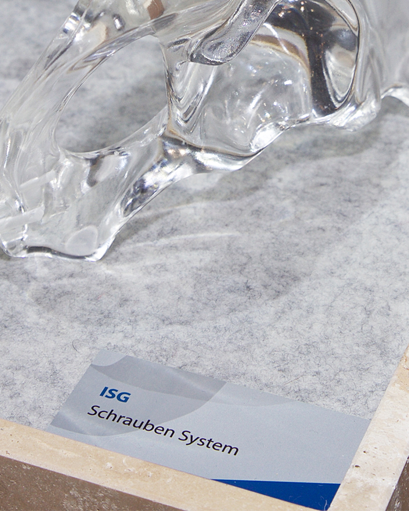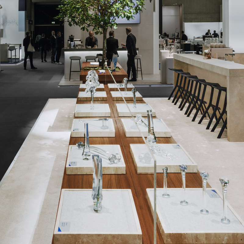 Auf einem langen Holztisch, der sogenannten “Bonebar” machen wir die Produktvielfalt für die Ärzte intuitiv erfassbar: klar inszeniert auf gläsernen Knochen und strukturiert präsentiert. Große Stehtische in der Nähe bieten Raum für den Austausch im Detail.