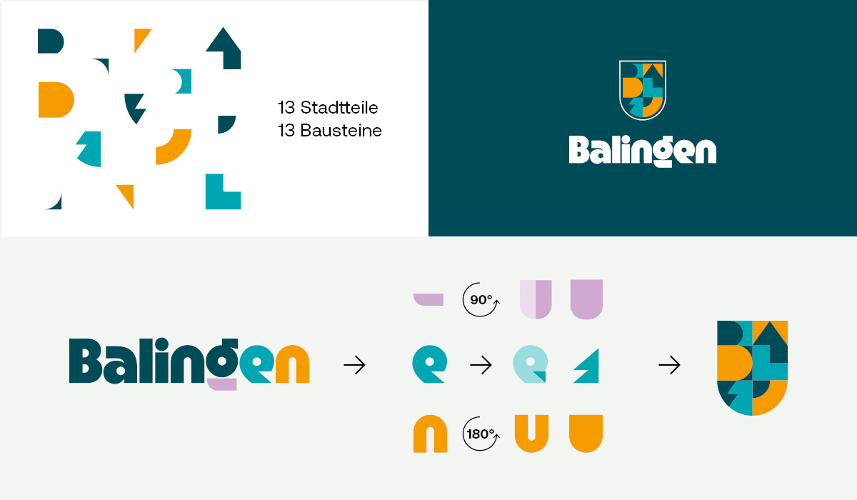 Die neue Bildmarke vereint Natur, Wasser und das prägende Stadtbild – inspiriert von der Umgebung, getragen von den Menschen. Die 13 Bausteine in bunter Farbgebung stehen für die 13 Stadtteile Balingens und spiegeln die Vielfalt, Kreativität und das Miteinander in Balingen. Der neue Schriftzug nimmt den geometrischen Charakter des bisherigen Schriftzugs auf und übersetzt ihn in eine moderne, prägnante Form. Auf dieser typografischen Grundlage entwickelt sich die Formsprache des neuen Logos. Dadurch greifen Bild- und Wortmarke nahtlos ineinander und bilden gemeinsam ein einheitliches, harmonisches Logo.